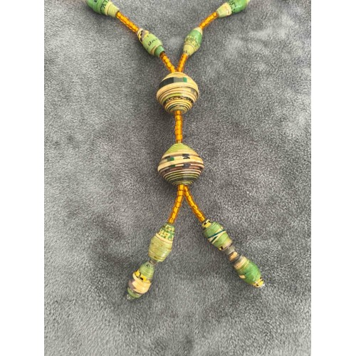 This necklace features mustard / green beads paired with larger, rolled-paper beads that showcase green, mustard, and black patterns. The central section has three vertically arranged beads, with two strands hanging elegantly below, each ending with smaller beads. The beads are strung together and separated with amber coloured ferrules. What makes it particularly special is how it incorporates recycled materials, blending sustainability with a unique aesthetic.